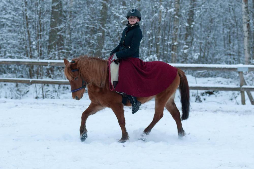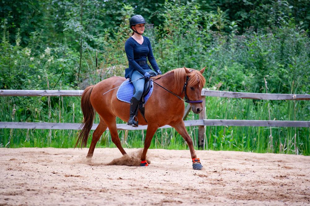 Hanskojen tiskiin heittäminen väheni pikkuhiljaa, kun aloin vähitellen pidentää ratsastusaikaa siten, että Lilyn protestoidessa pyysin aina vielä pienen hetken aikaa jatkamaan ja sitten lopetimme treenit pieneen onnistumiseen. Näin Lily oppi, että kuuntelen kyllä mielipidettä, mutta emme koskaan suoraan lopeta voimakkaaseen protestointiin. Lily alkoi lopulta ilmoittaa väsymisensä merkittävästi hienovaraisemmin ja kun samalla vaivihkaa nostin vaatimustasoa ja treenin kestoa, Lilyn kanssa alkoivat sujumaan pidemmätkin treenit. Nykyään voimme ihan helposti tehdä tunnin treenejä ilman, että Lily ilmaisee epämukavuutta tai väsymistä.