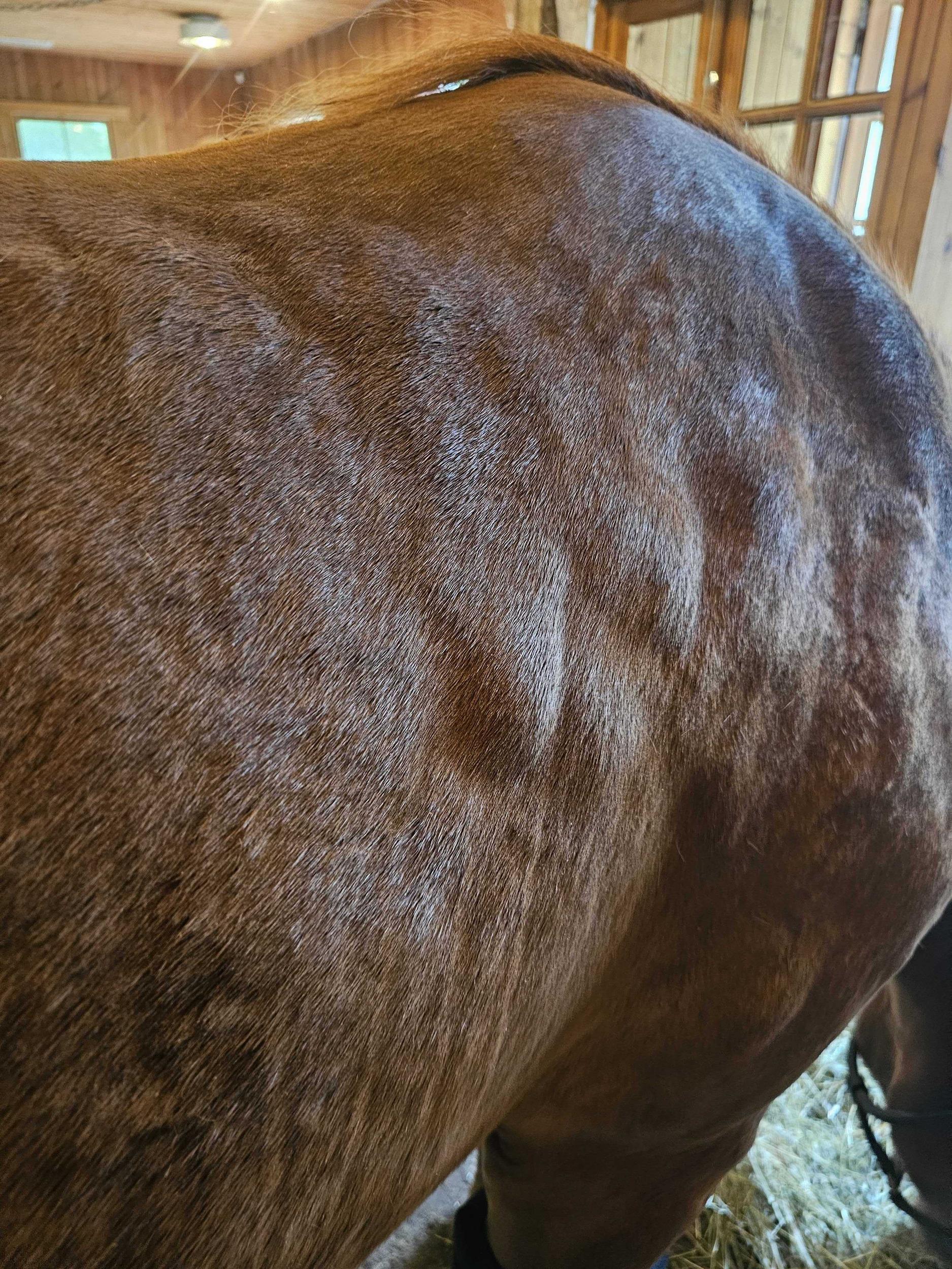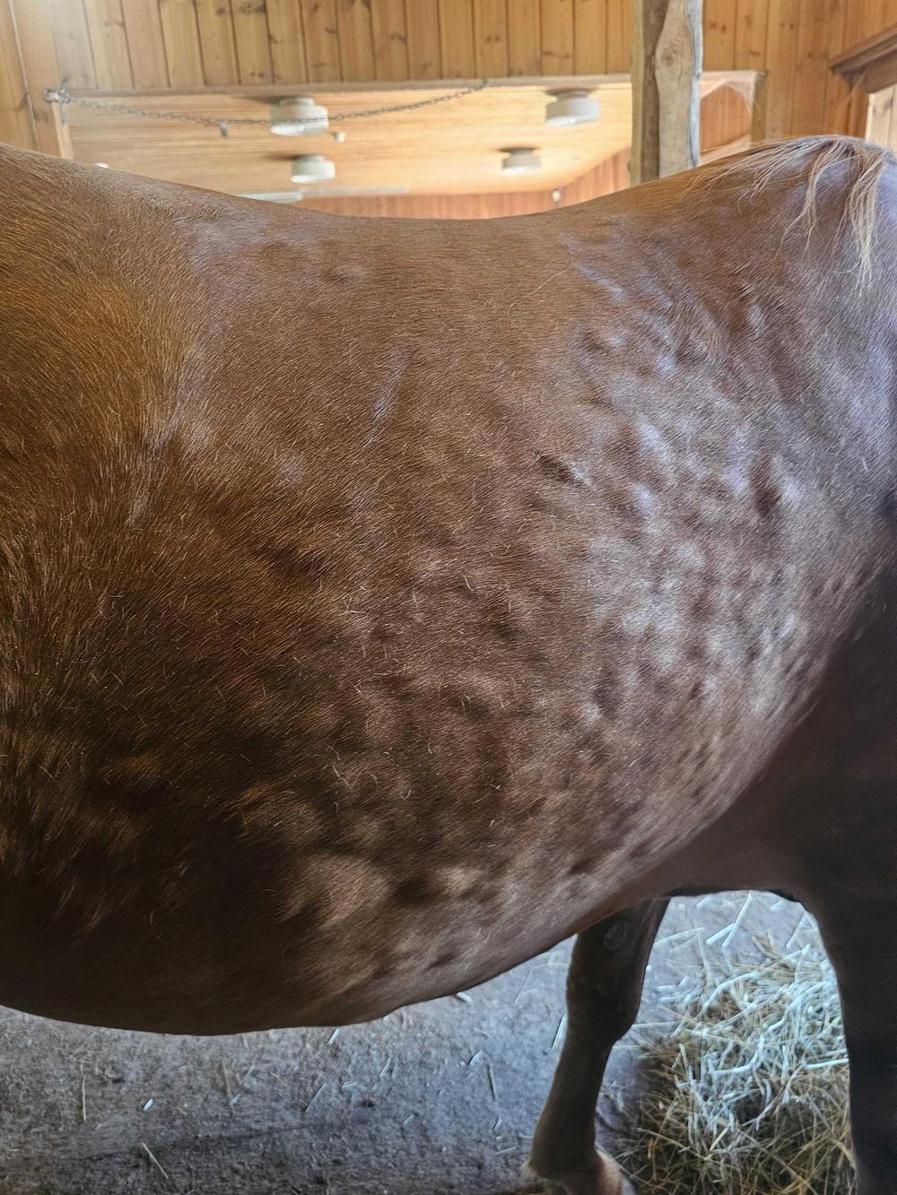 Epäilimme ensin ötököitä syyksi, mutta edes ihottumaloimen käyttö ei rauhoittanut oireita. Vasta jälkikäteen alkoi hahmottua mahdollinen yhteys ruokintaan. Iho-oireet ajoittuivat aikaan, jolloin Lily söi parin viikon ajan sokeripitoisempaa heinää, ja ne alkoivat vähitellen rauhoittua, kun siirryimme matalasokerisempaan heinään. Muutos ei ollut nopea tai selkeä, vaan tapahtui pikkuhiljaa, mikä teki yhteyden huomaamisesta vaikeaa.