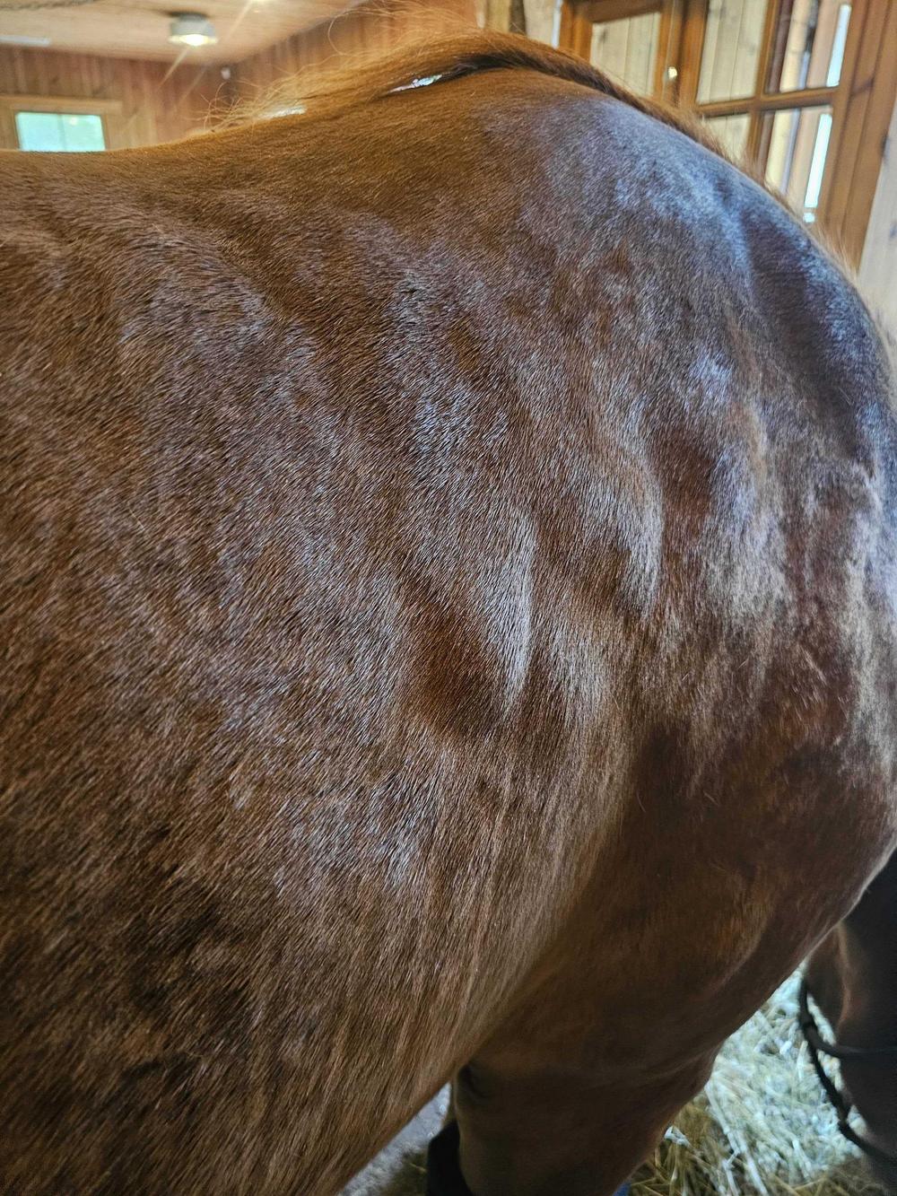 Seuraavana talvena patit ilmestyivät vielä kerran uudelleen, kun Lily oli ahminut normaalin heinämääränsä lisäksi kuivikkeena ollutta olkea. Epäilen, että myös silloin sokerin kokonaismäärä saattoi nousta liian suureksi ja Lily reagoi siihen. Tällä kertaa patteja oli vain kehon takaosassa, joten pystyin pukemaan Lilylle varusteet. Päätin käydä ratsastamassa ja katsoa, häviäisivätkö patit hikiliikunnan avulla, sillä epäilin että niiden syy voisi liittyä myös aineenvaihduntaan. Ratsastin Lilyn hikeen ja ratsastuksen jälkeen kaikki patit olivat kadonneet kuin taikaiskusta. Tapauksesta on nyt vuosi aikaa, eikä iho-oireita ole enää sen jälkeen ilmennyt. Otimme myös oljet pois pihatosta, jotta Lily ei enää ahmisi niitä yli tarpeidensa.