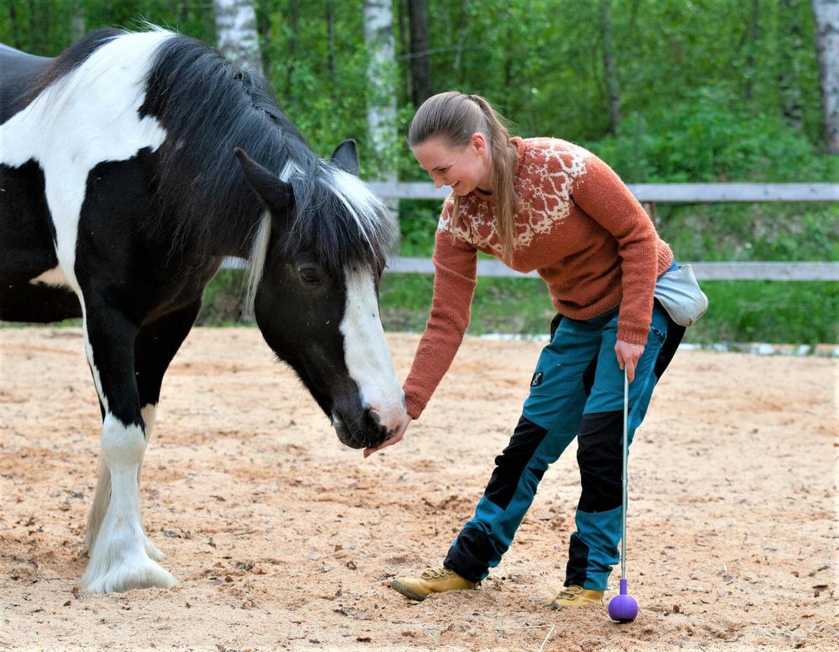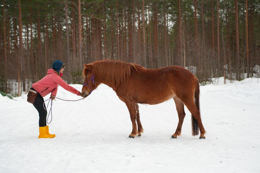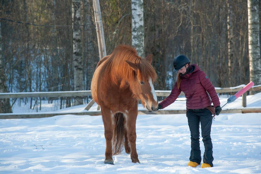 Kannattaa tarjota tauoilla esimerkiksi heinää tai muuta rauhoittavaa syötävää – vaikkapa isompi kourallinen samaa rehua, jota hevonen saa muutenkin koulutustilanteessa palkaksi.